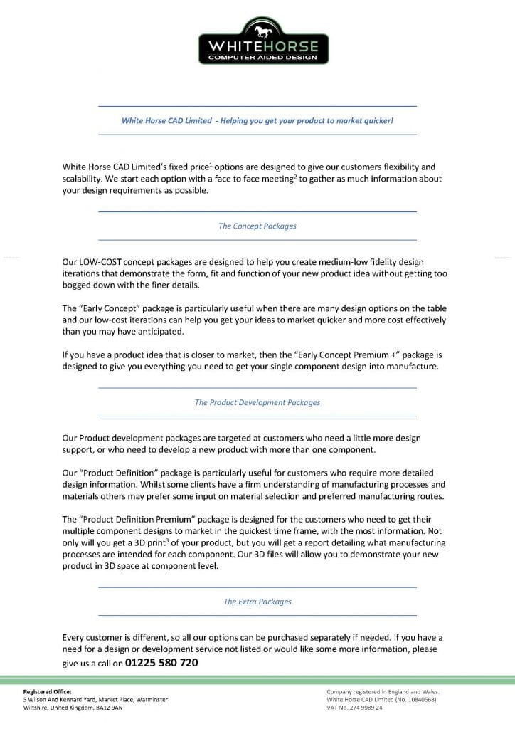 White Horse CAD limited is passionate about making new product development accessible to everyone. Our FIXED PRICE product design packages start from as little as £49+VAT.