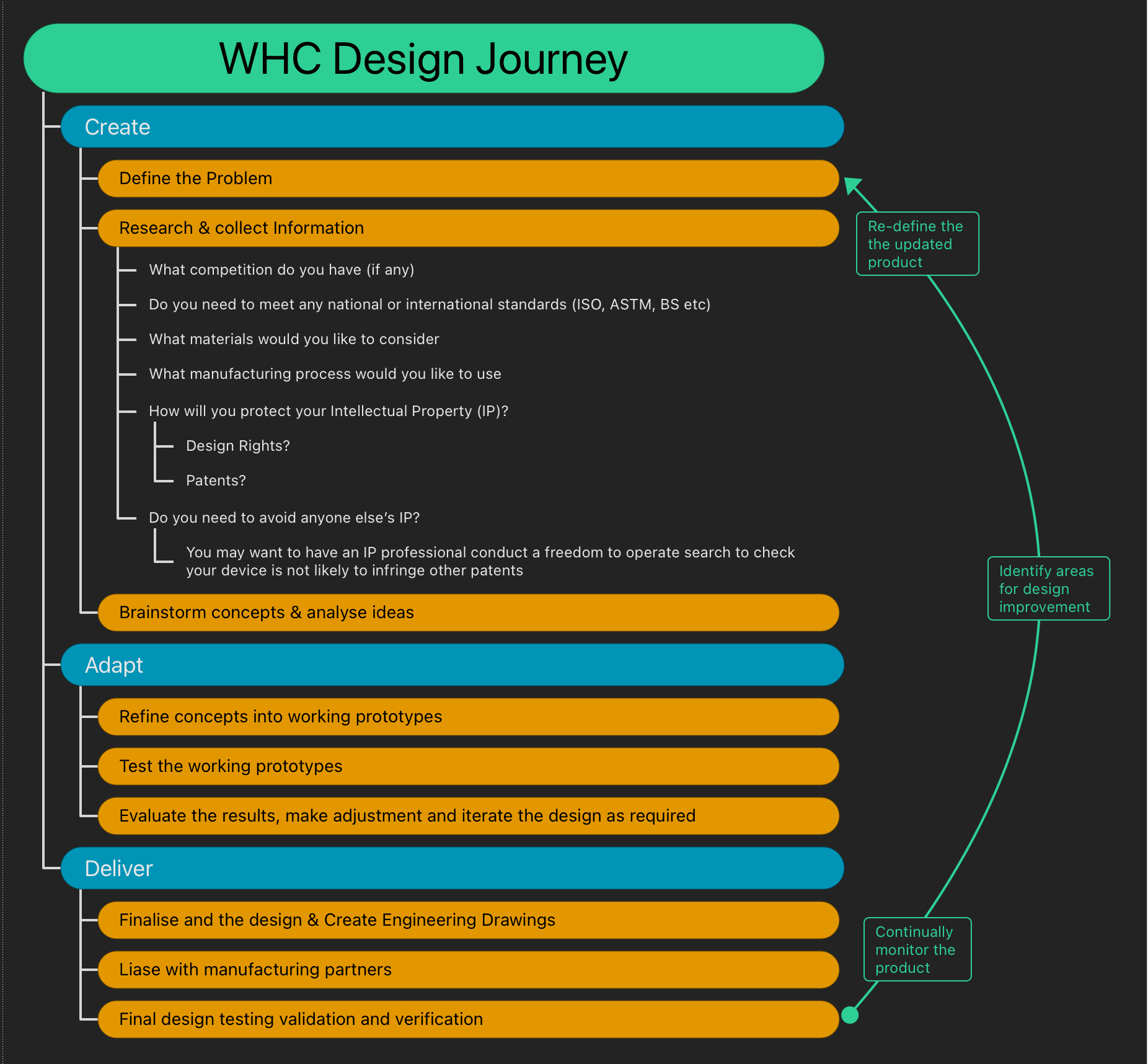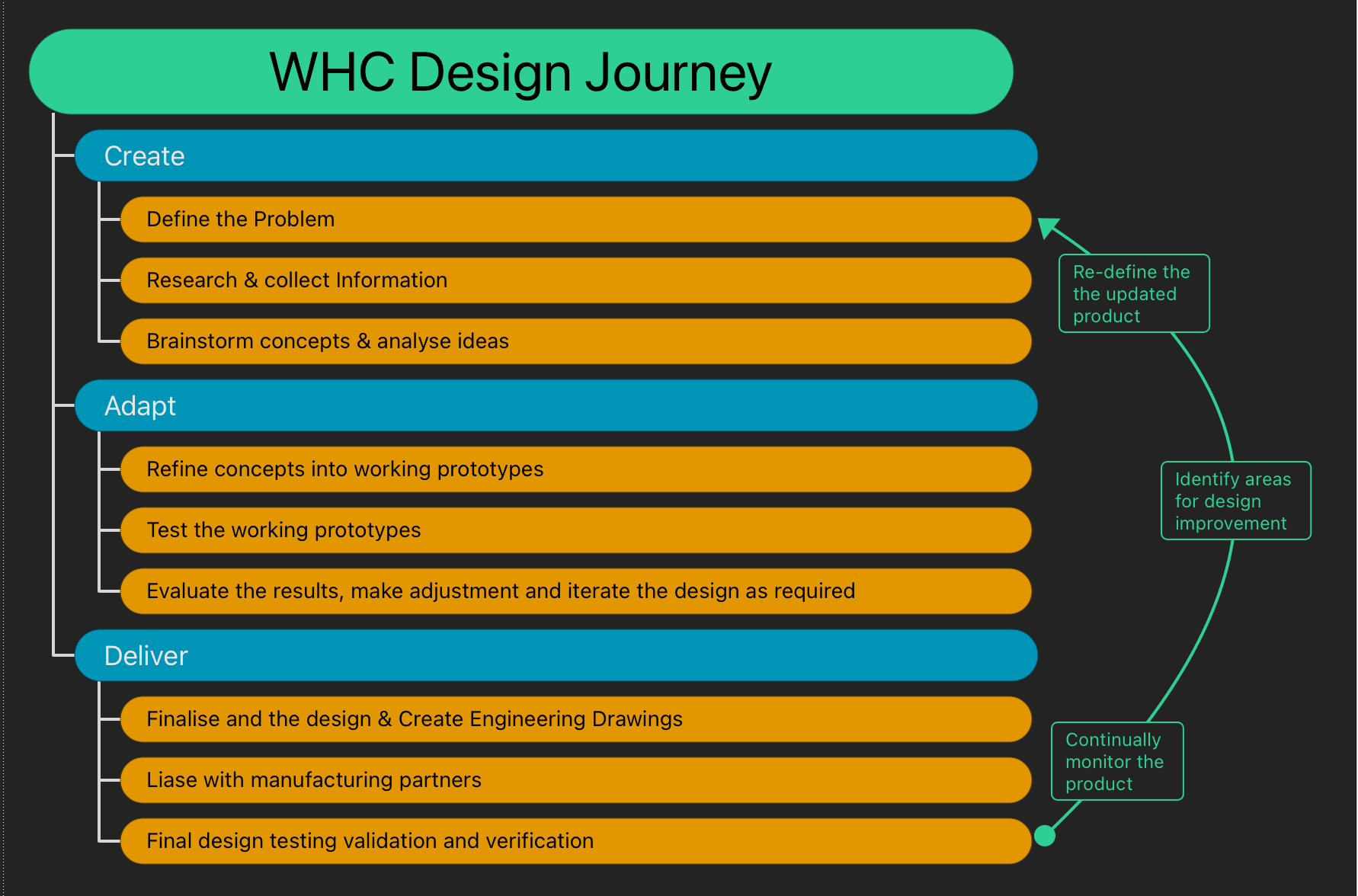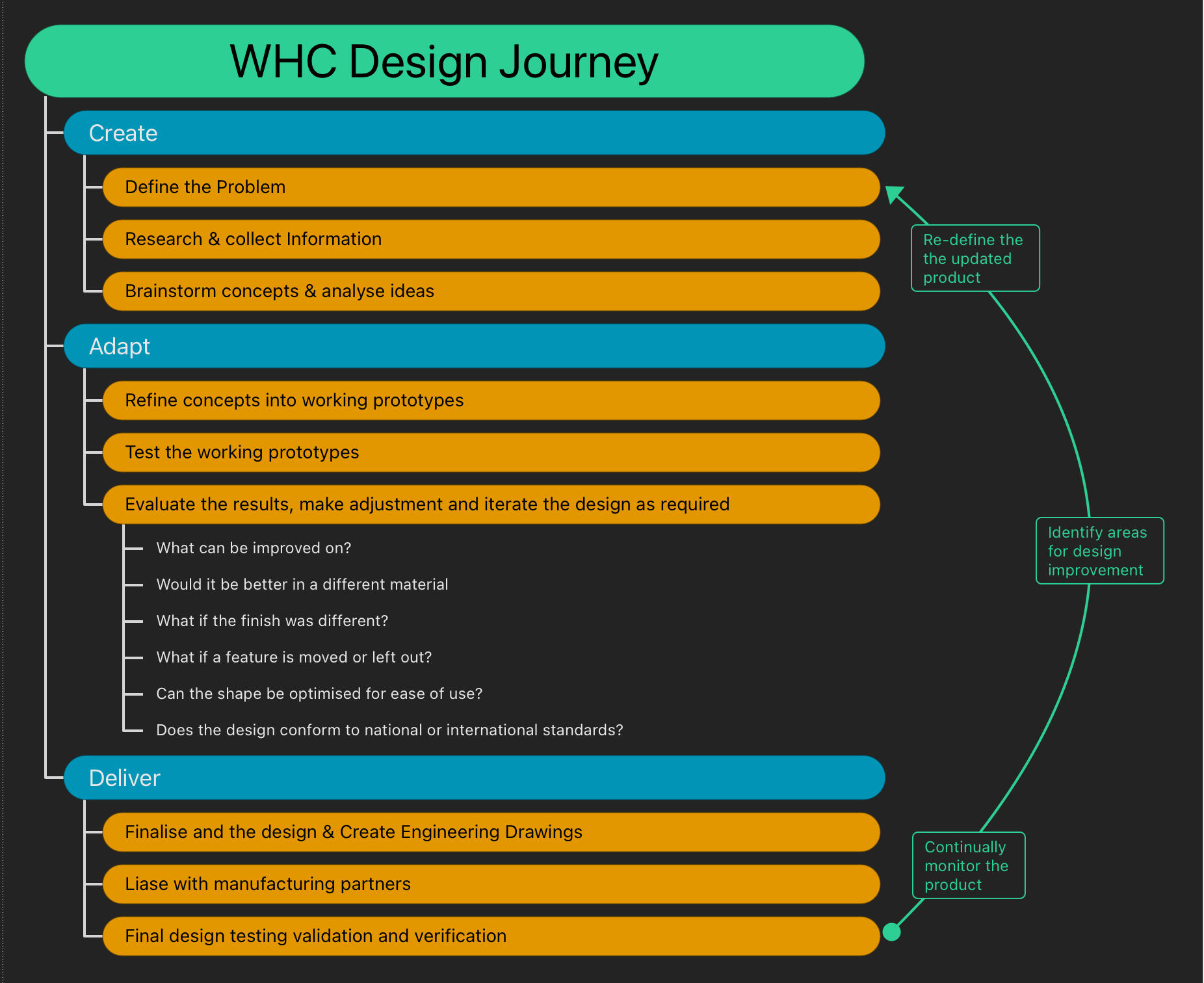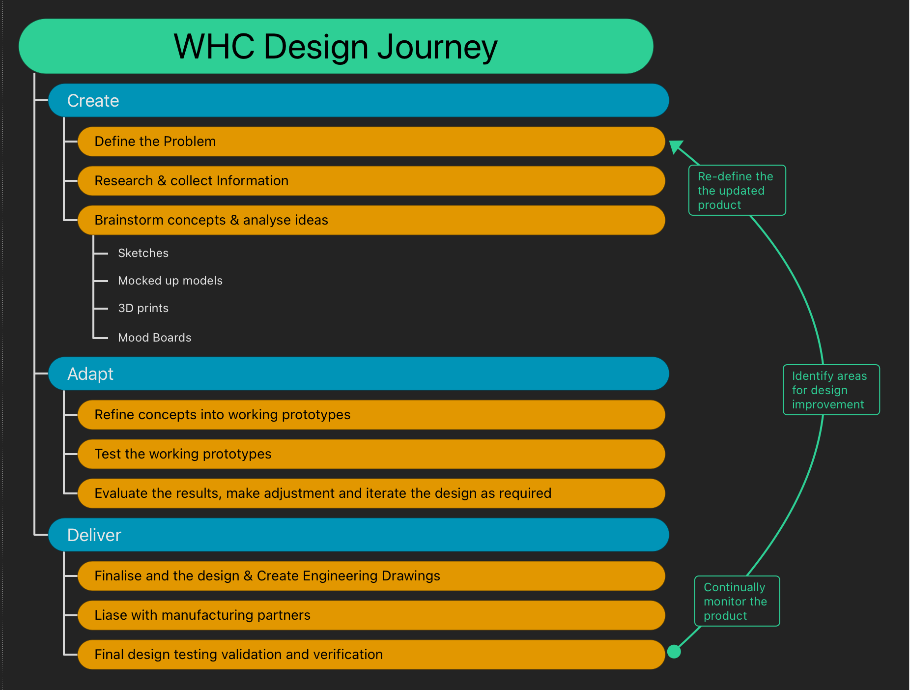 Our design process is split into three stages: Create, Adapt, and Deliver. The slides on the right will help you to visualise the WHC design process and may help you pick out where you are in your design journey.
