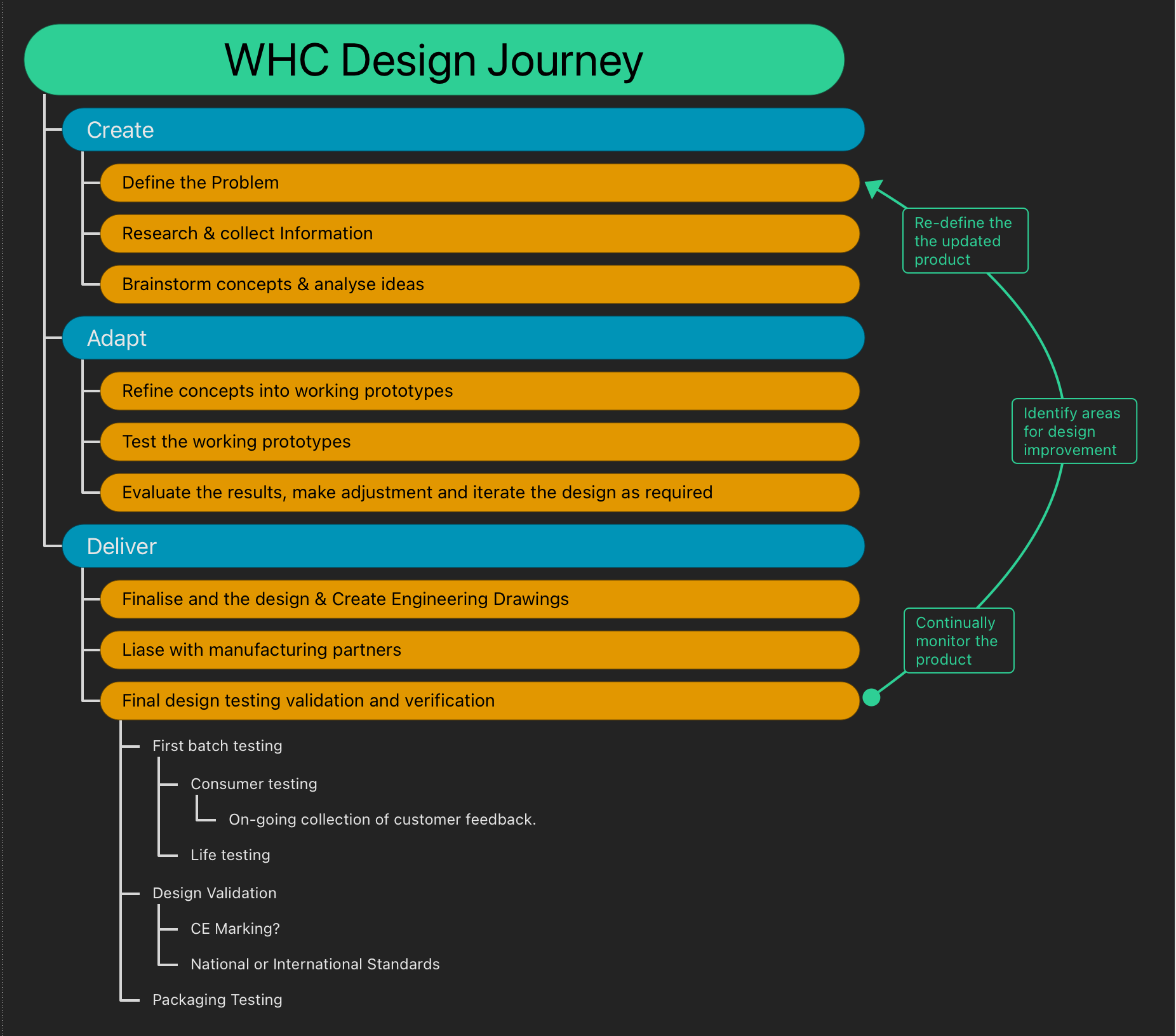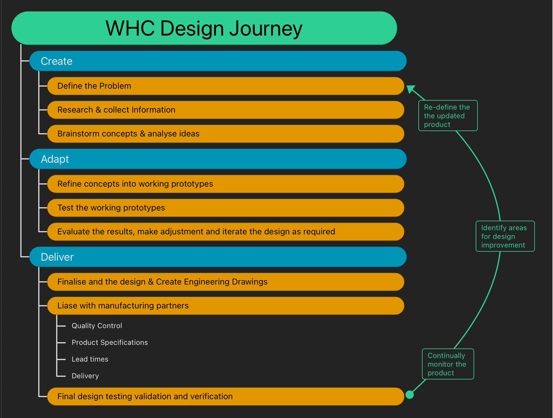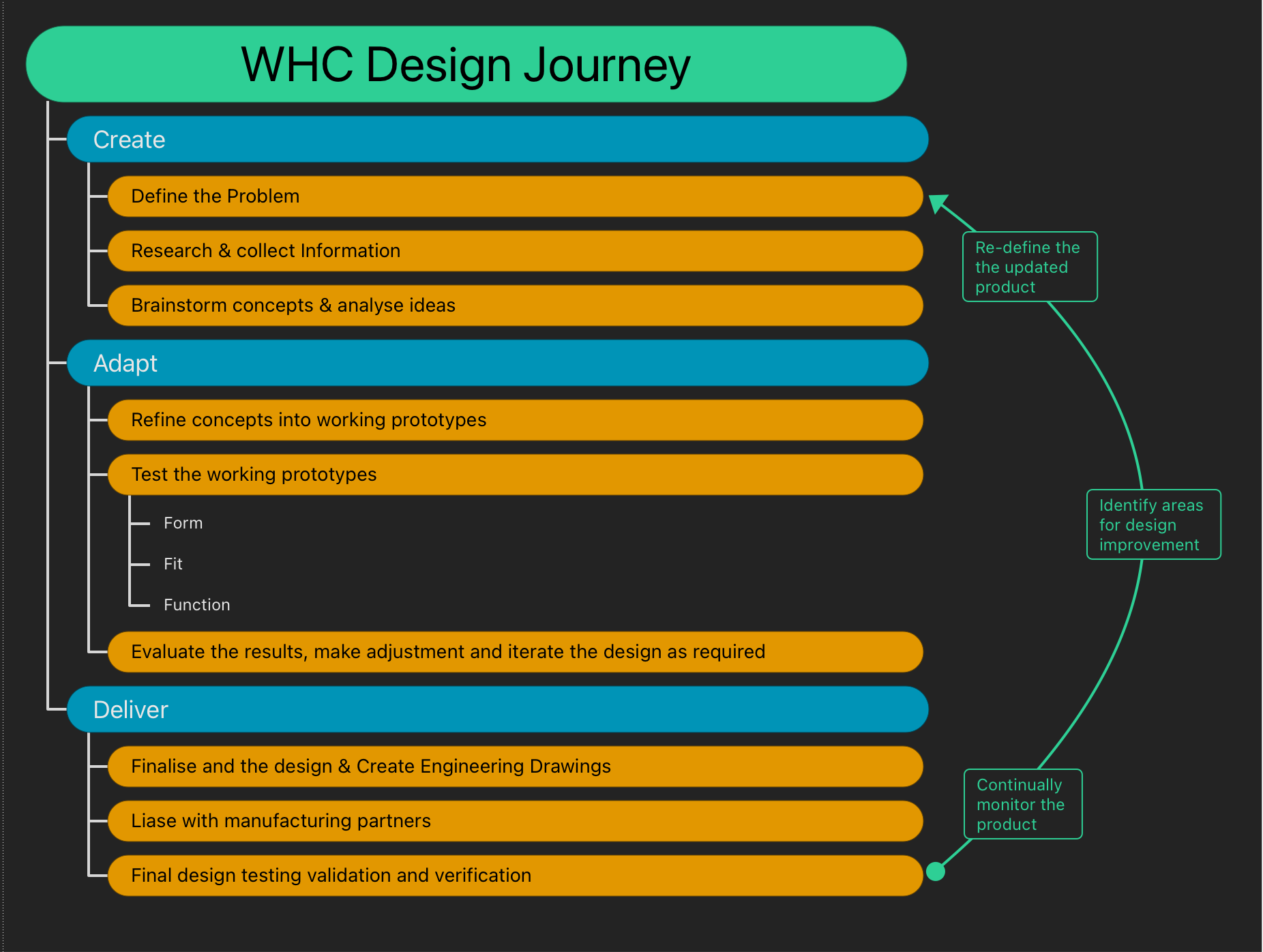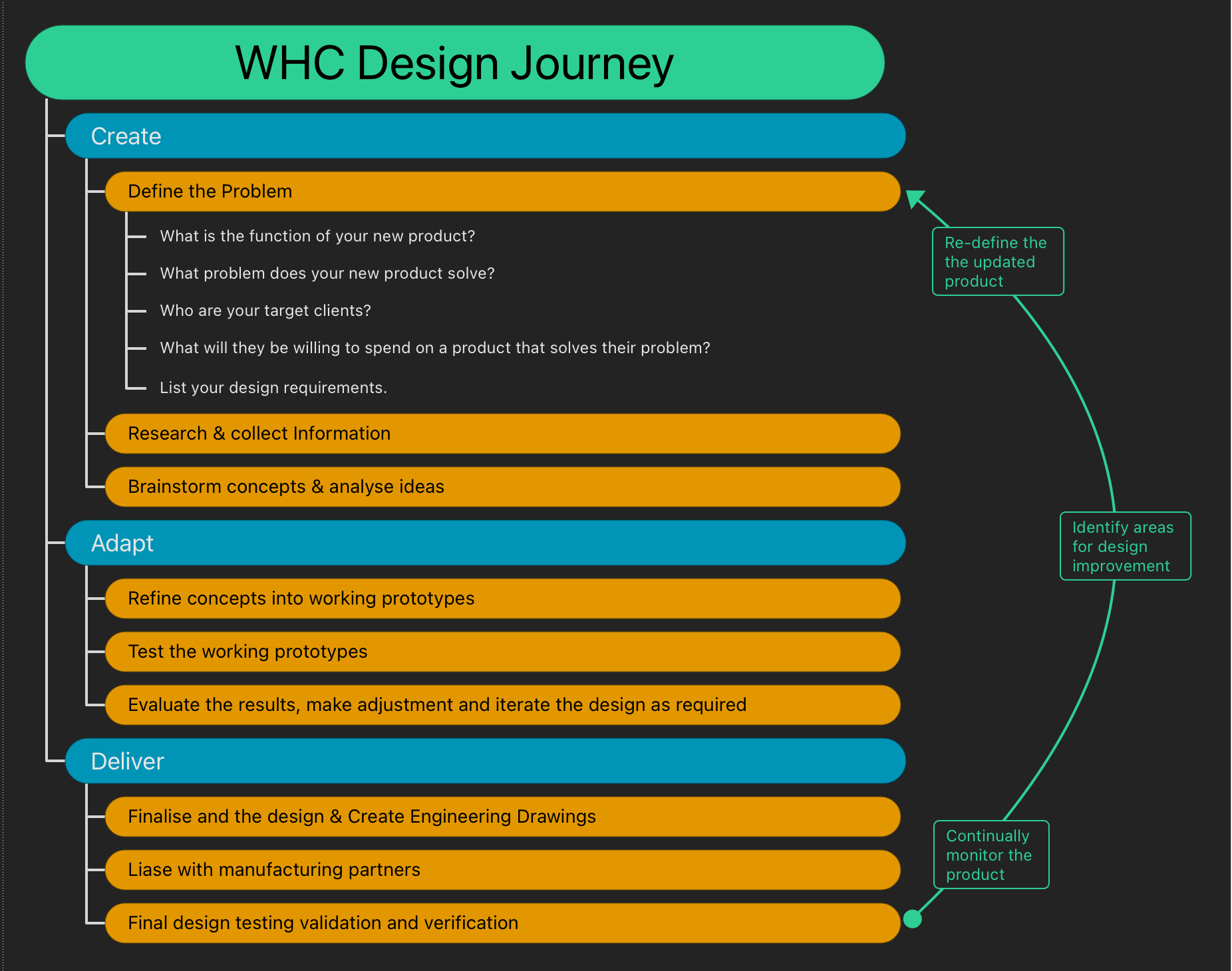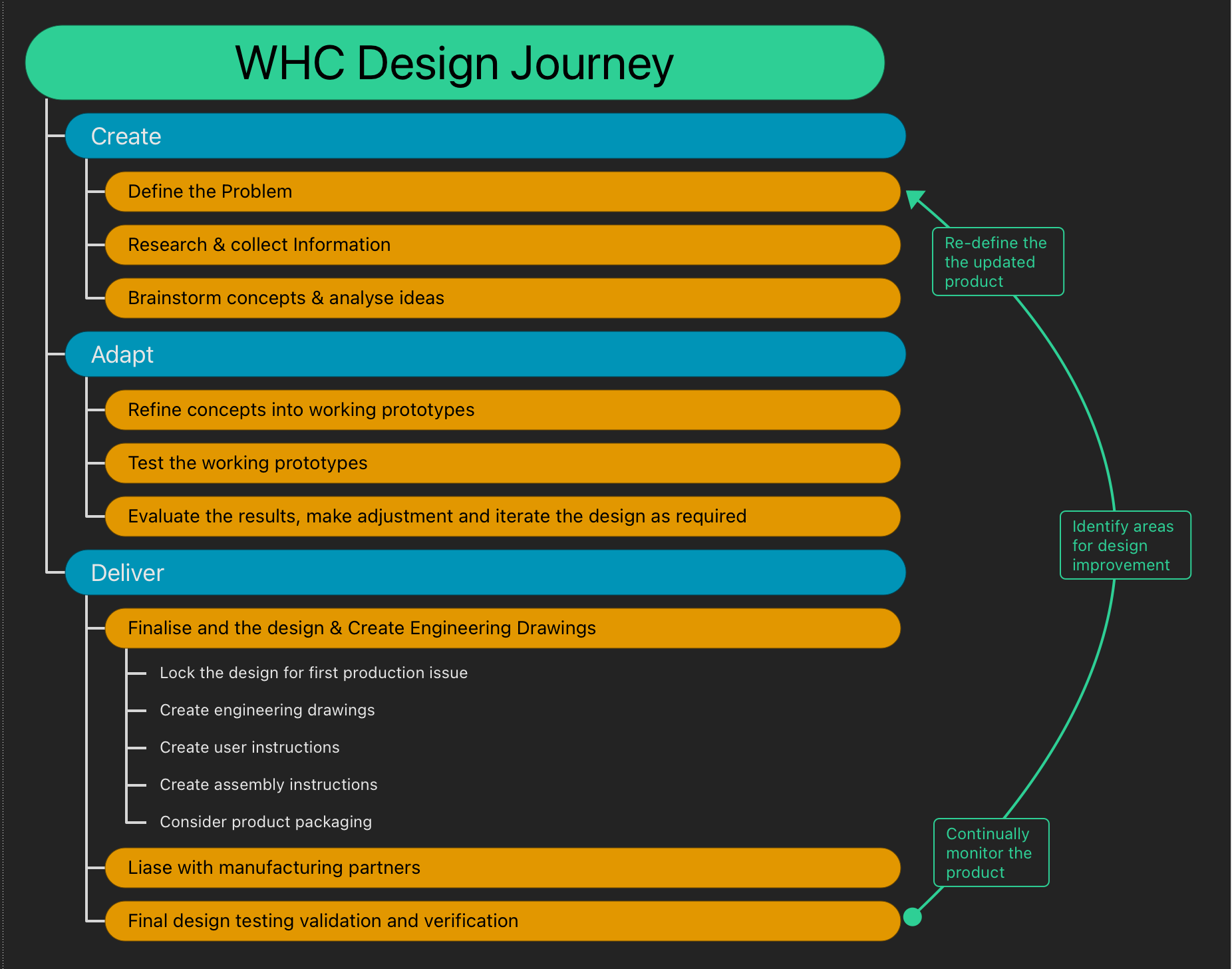 Our design process is split into three stages: Create, Adapt, and Deliver. The slides on the right will help you to visualise the WHC design process and may help you pick out where you are in your design journey.