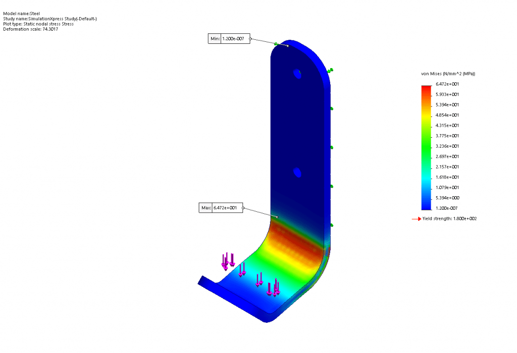We know from the results above the bag is going to cause around 64MPa of stress on the hook. SolidWorks confirms hot rolled mild steel has a yield stress of around 180MPa. Therefore, we can be confident this second material will be more than adequate to hold the bag. But let’s run the analysis to reinforce our confidence…